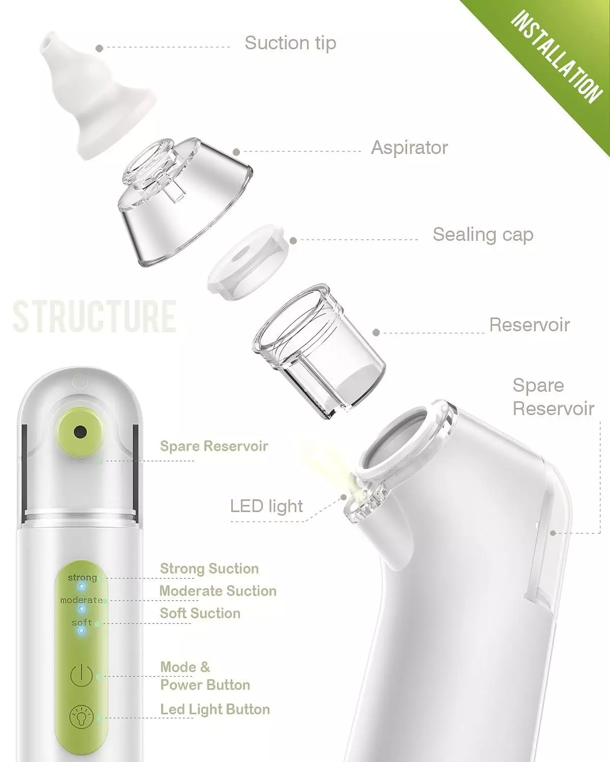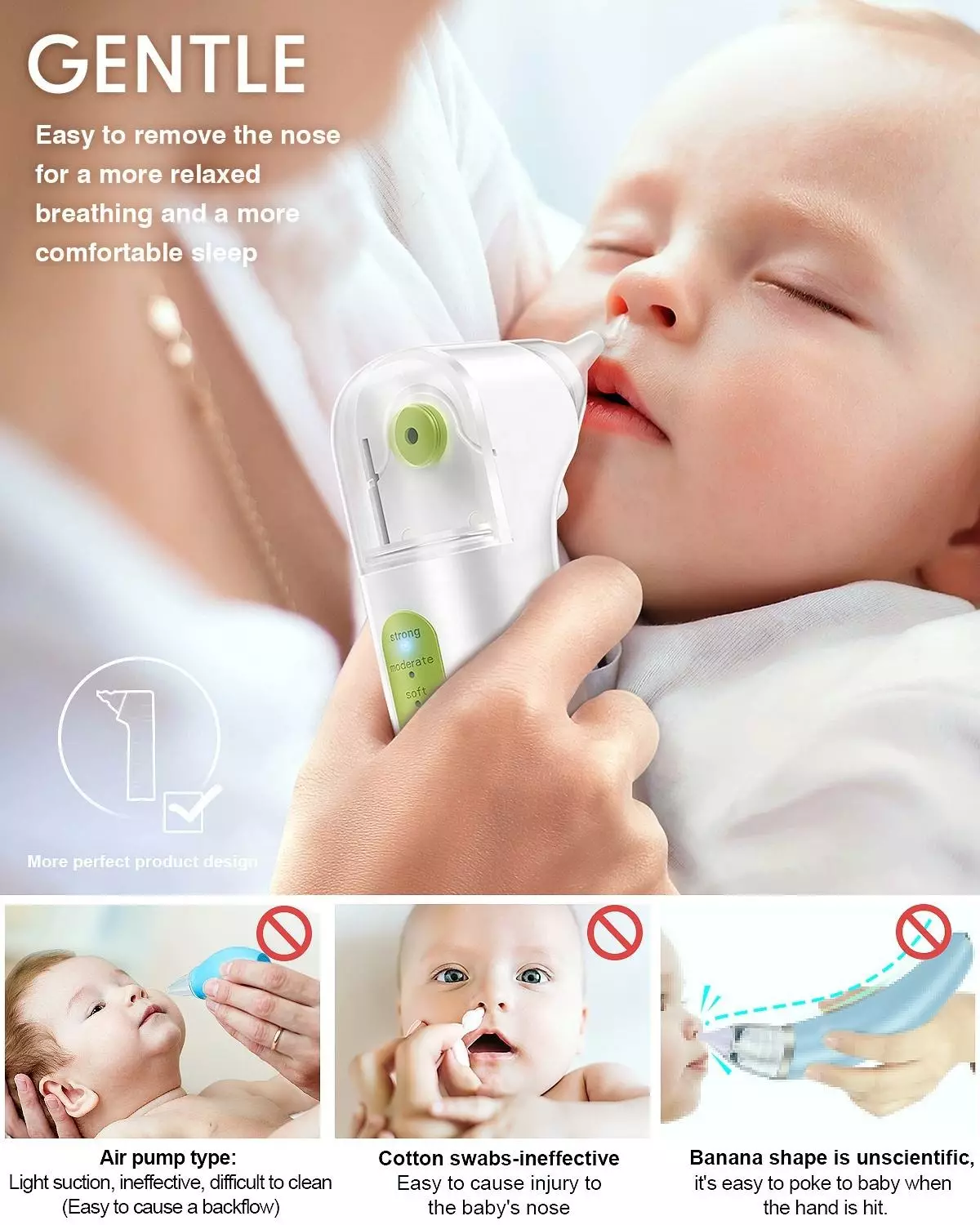 It is recommended to use strong suction mode, put the silicone tip into one of the baby’s nostrils, while closing the other nostrils with the fingers, this will immensely increase the suction effect.