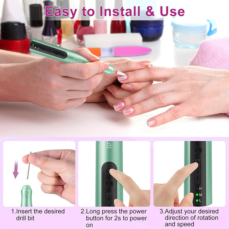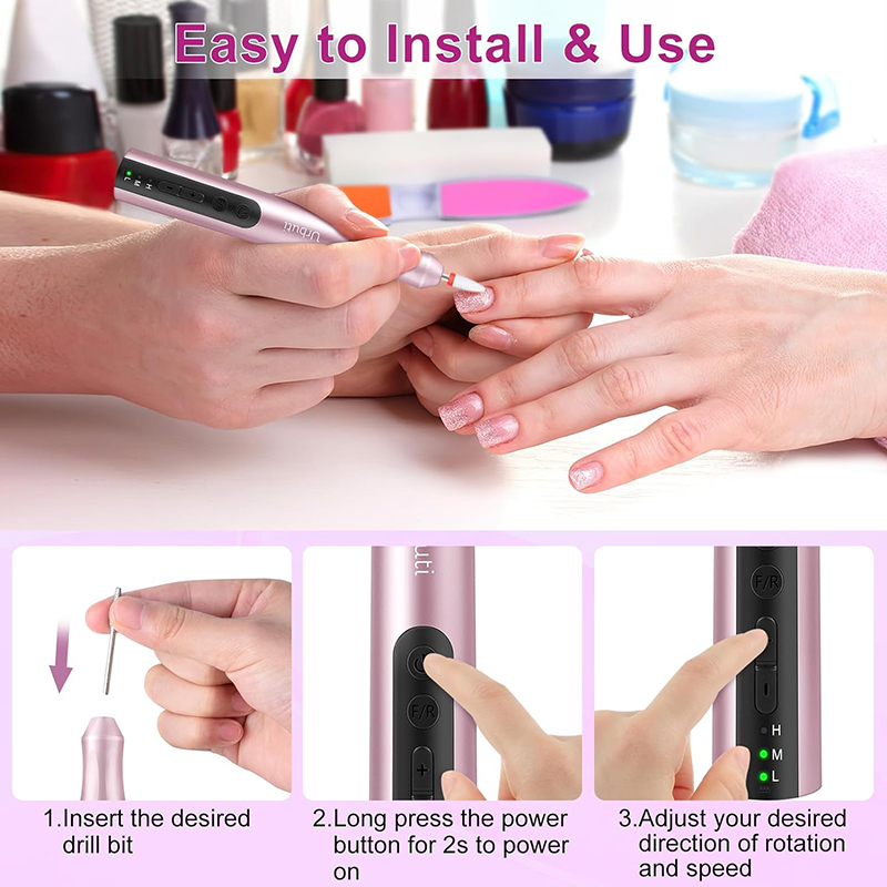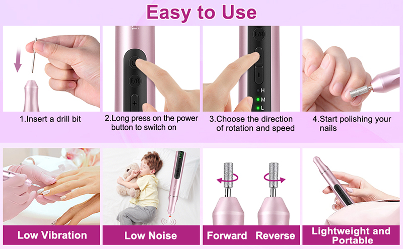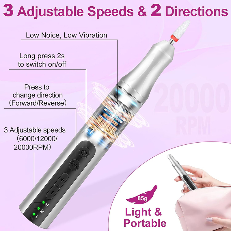 Nail files professional is designed with 3 speeds of 6000-12000-20000, just short press the + or - button to increase or decrease the speed. Easy to adjust the speed and save time when sharpening nails. The direction of the drill can be easily changed by pressing the F/R button, ideal for left-handed people, master nail artists or beginners for nail care.