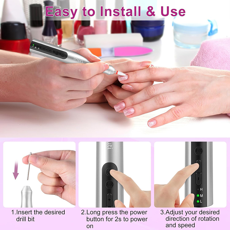 This electric nail drill features the latest aluminum body with anti-vibration design, which can effectively reduce noise and heat when grinding nails, ensuring you won't disturb anyone while polishing your nails. The ergonomic pen shape appearance makes for a comfortable non-slip grip and allows you to remove gel nails with ease.