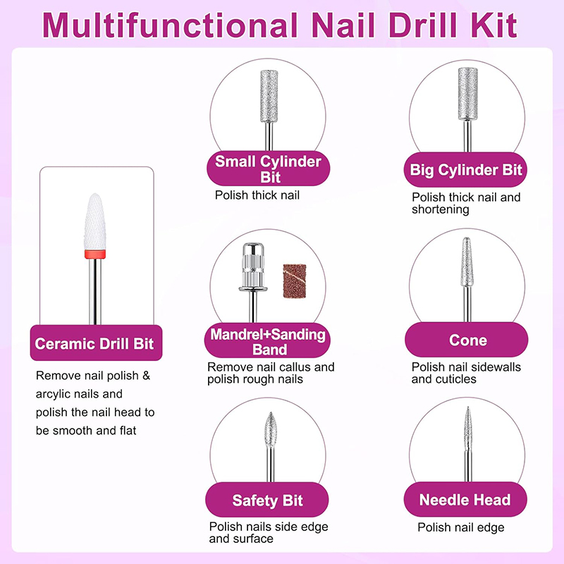 Nail drill machine includes 6 stainless steel nail drill bits, 1 ceramic drill bit and 36 interchangeable sanding strips. Manicure pedicure kit can be used for manicures, pedicures, polishing, shaping, cuticle grinding, acrylic/gel nail removal, or for nail beauty. Complete with accessories and easy to use, perfect for nail art beginners !