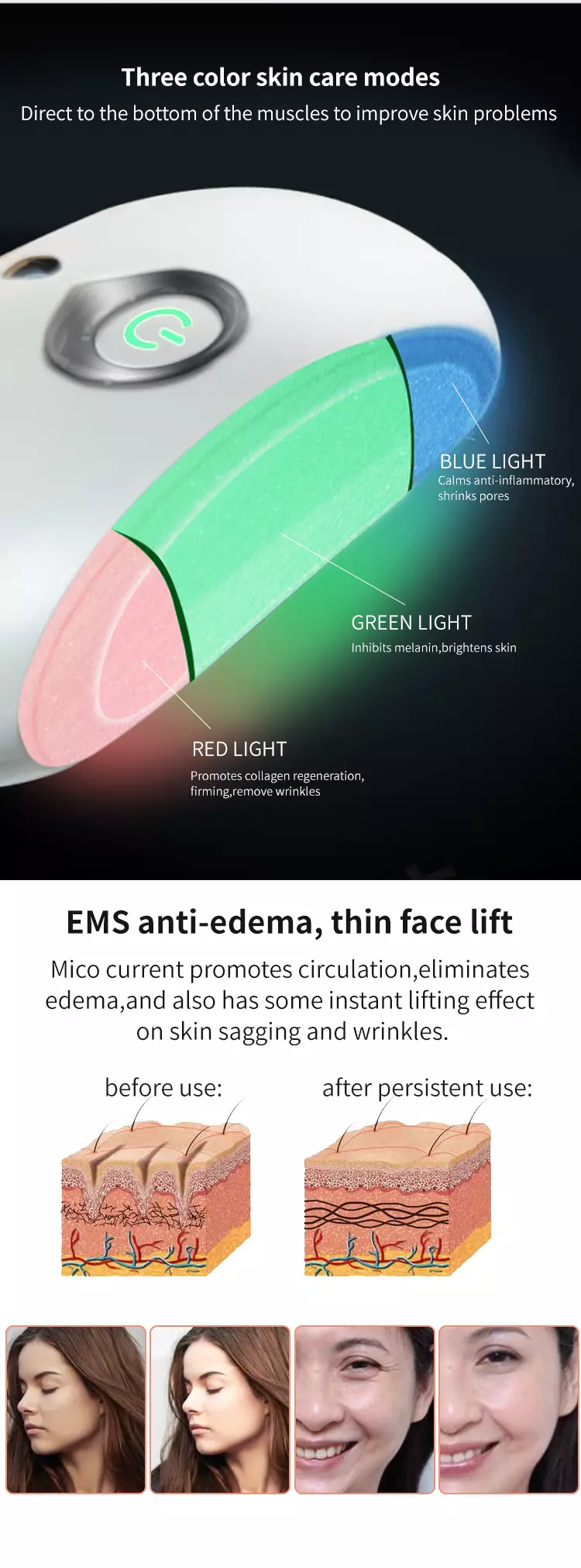 Three color skin care modes,Direct to the bottom of the muscles to improve skin problems