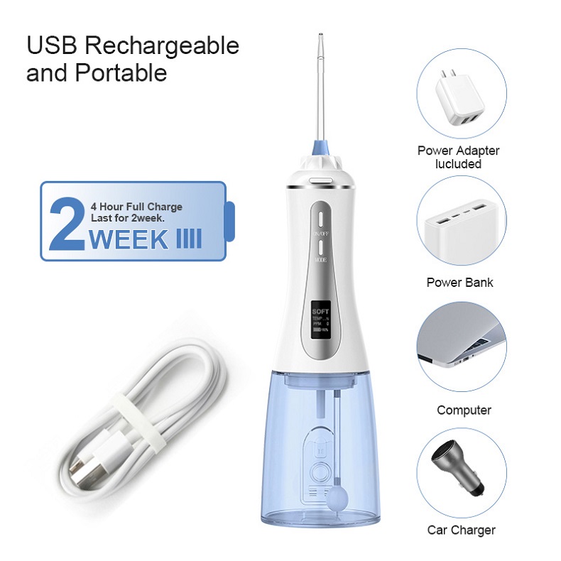 This water dental flosser boasts double the battery life of others with a powerful eco-friendly battery. Just charge for 3 hours and enjoy 30 days of use. It's compact and lightweight, perfect for home and on-the-go use. This water dental pick comes with a USB cable (adapter not included) making it an ideal travel kit. Benefit from an exceptionally long 30-day battery life, making it a truly portable solution for your convenience