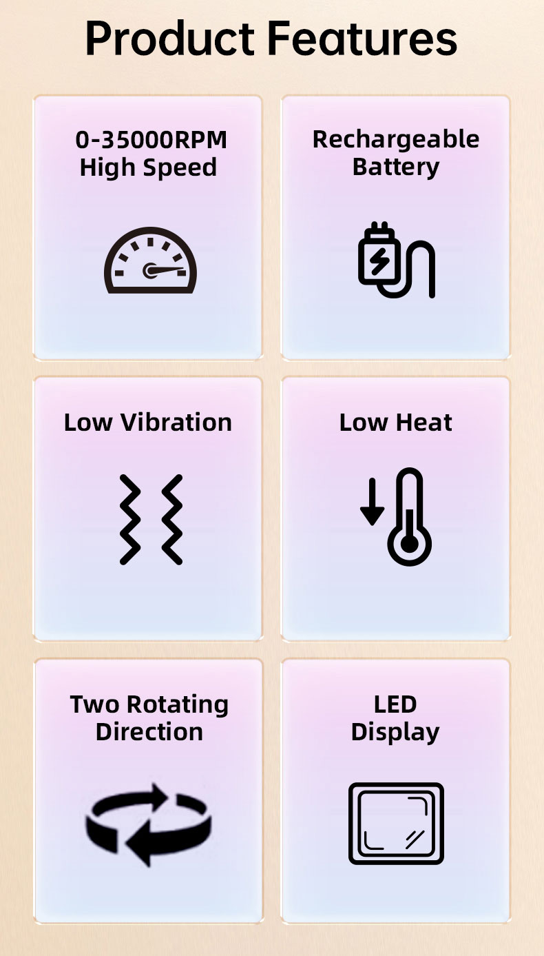 Light Weight Handpiece: Made of the special material, aluminum alloy. Ample ventilation holes are designed for dissipating the heat effectively. Do your nail smoothly and enjoy the feeling of low vibration. It will not let your hand be numb after long-term use. Pencil-shape and lightweight design are perfect for extended use. (works with all kinds of 3/32” shank bits).