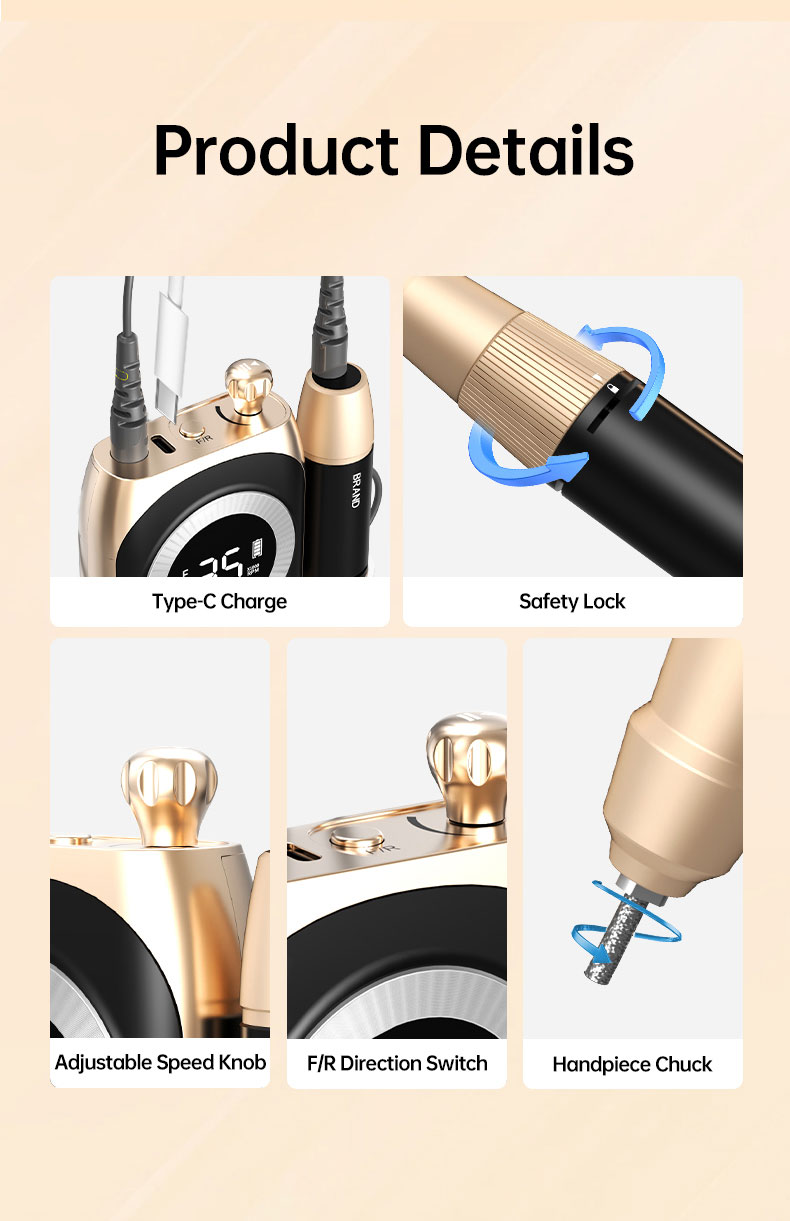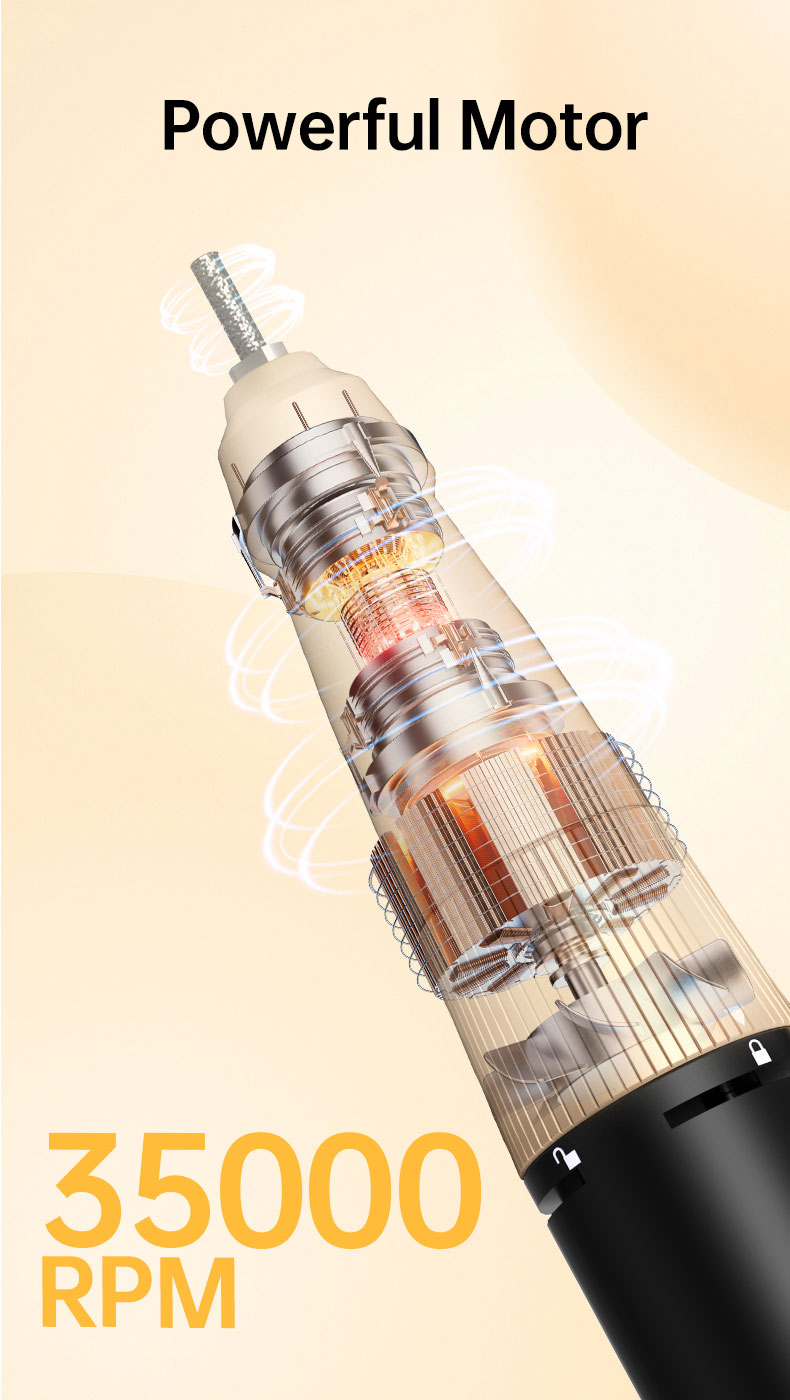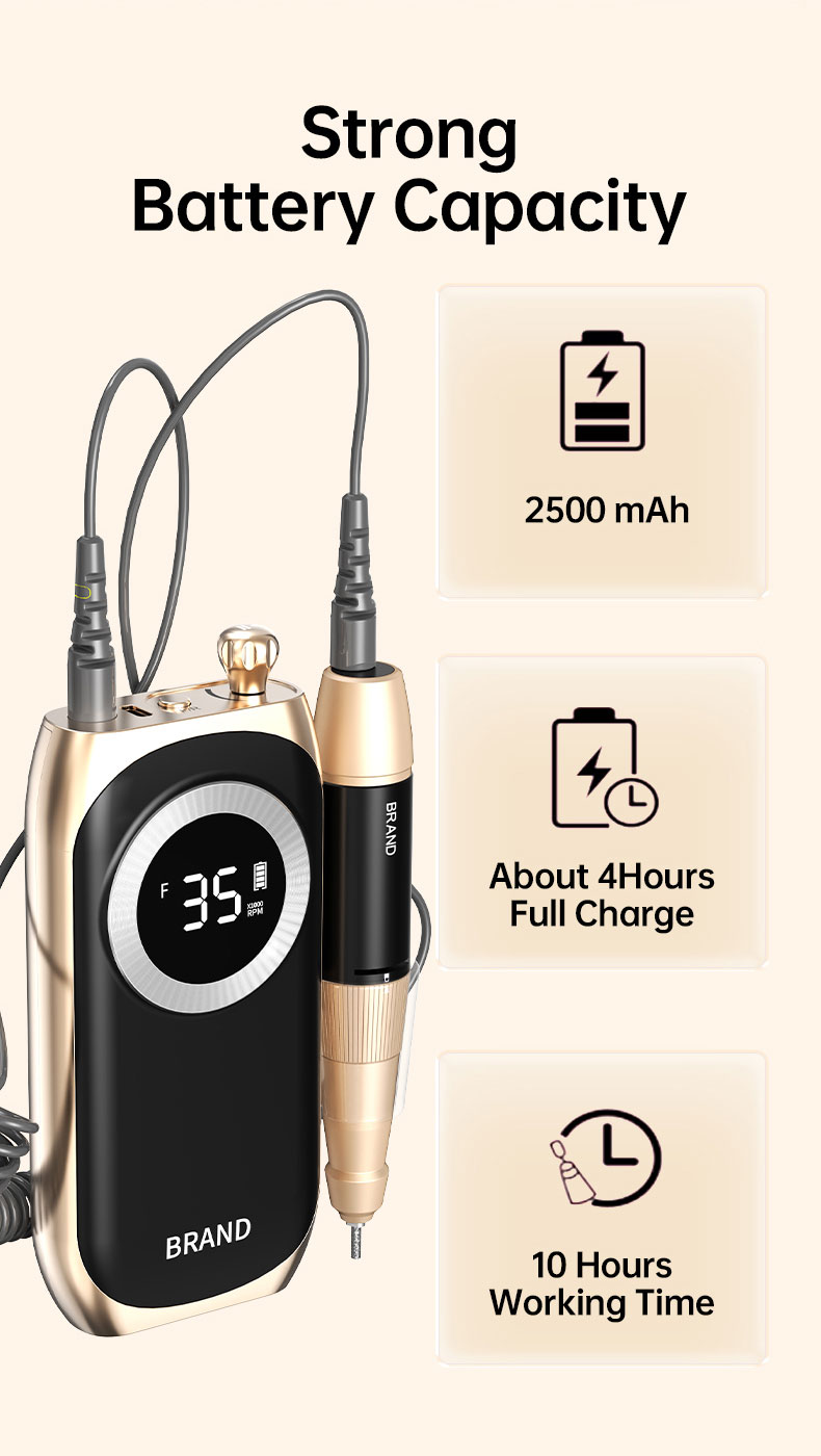 Rechargeable and Cordless: With a large battery capacity(2500mA), you can use this nail drill at anywhere anytime. Being fully charged for about 4 hours, the electric nail file will work up to 10 hours. The smart LCD screen will display the precious RPM and electricity. A Belt clip of the body case allows you to hang it on your belt on the waist and it is compact enough(6.08*2.94*0.98) to pack into your traveling bag or case.