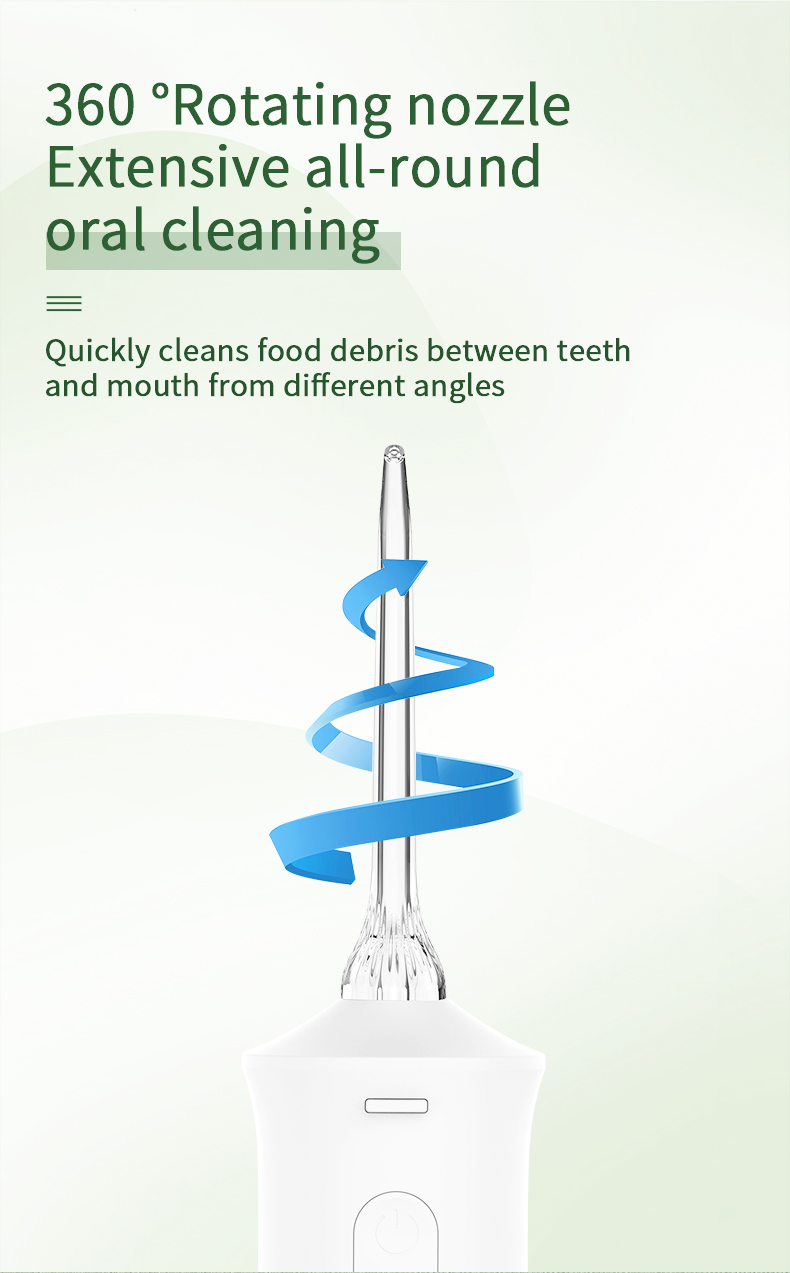 This water dental flosser boasts double the battery life of others with a powerful eco-friendly battery. Just charge for 3 hours and enjoy 30 days of use. It's compact and lightweight, perfect for home and on-the-go use. This water dental pick comes with a USB cable (adapter not included) making it an ideal travel kit. Benefit from an exceptionally long 30-day battery life, making it a truly portable solution for your convenience
