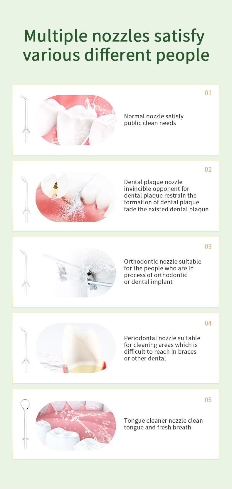 This water dental pick delivers high water pressure pulses at 1400-1800 times per minute, effectively removing 99.9% of dental plaque for deep teeth cleaning. This water dental pick massages the gums, promotes blood circulation, and addresses oral issues like bad breath, orthodontic teeth