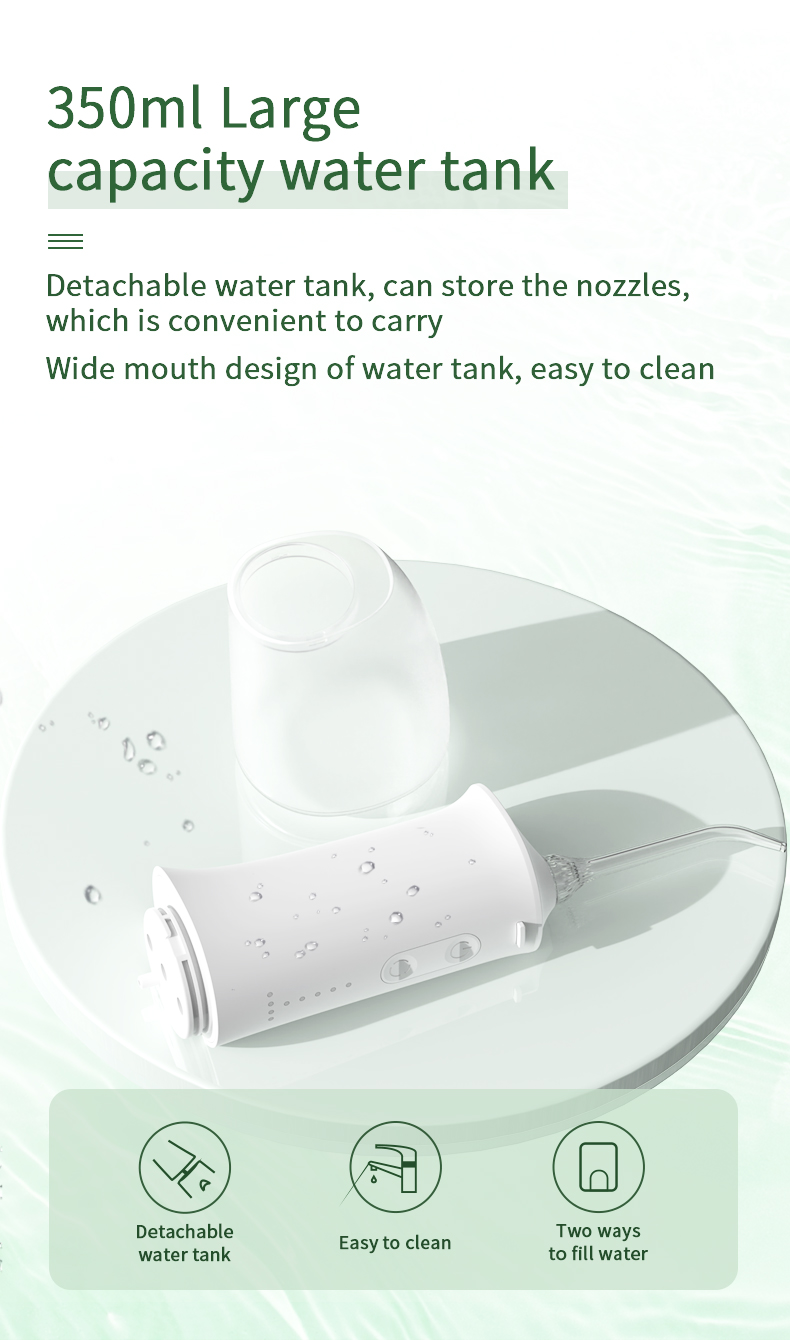 This water dental flosser features an upgraded 350ml water tank, twice the capacity of other old models, eliminating the need for frequent refills and making your oral cleaning more convenient and efficient