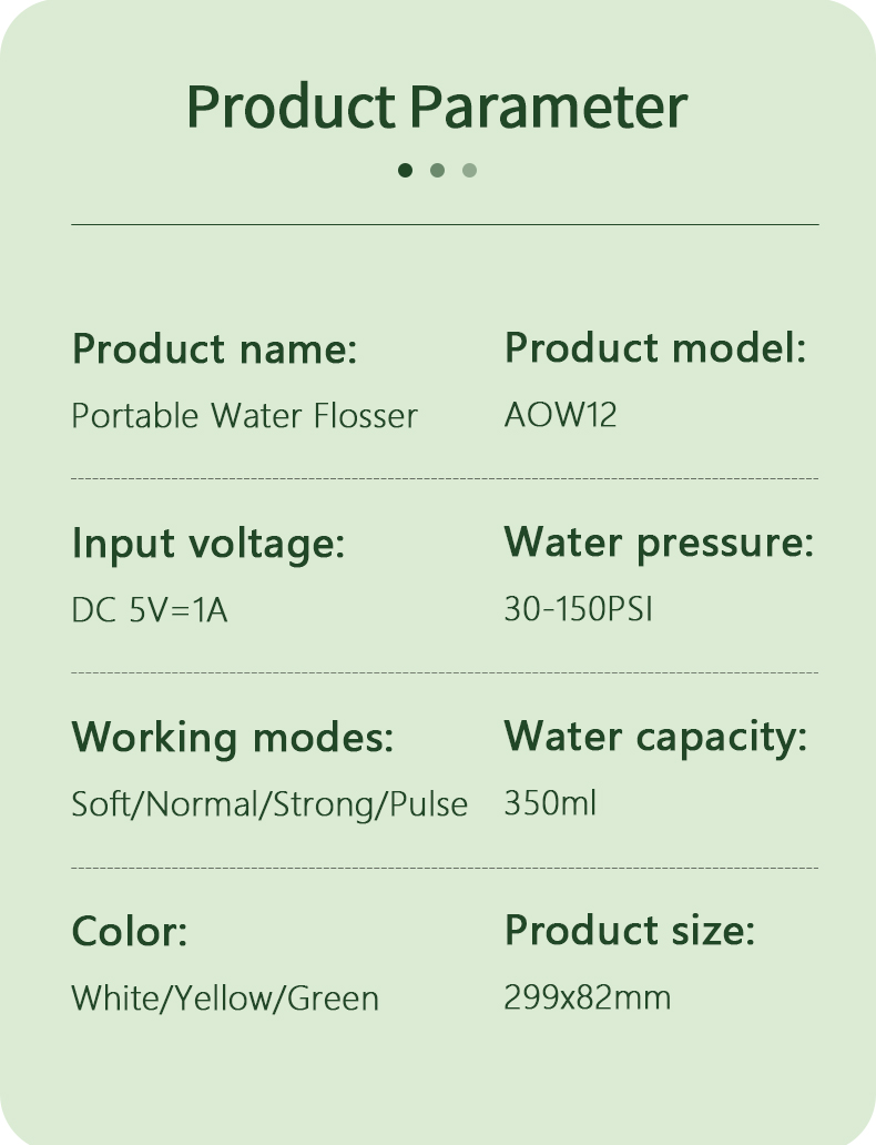 Package:1pc water flosser body+5pcs tips+1pc USB cable+1pc user manual+1pc gift box.